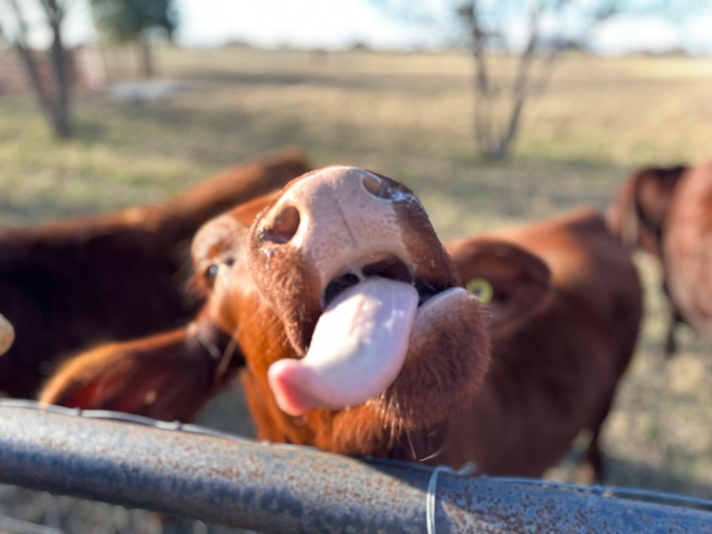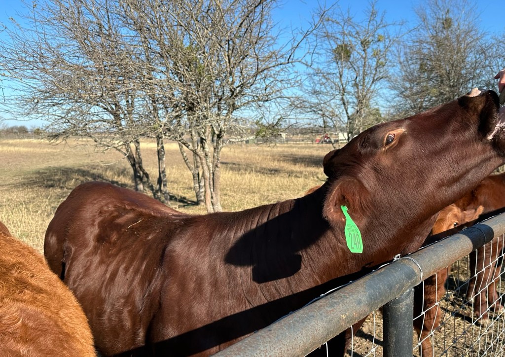 The Santa Gertrudis is an American breed of beef cattle. It is a taurine-indicine hybrid breed, descended from both zebu and European cattle. It was bred in the early twentieth century in Texas, and received official recognition in 1940.